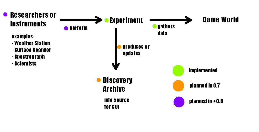 Discovery mechanics are is process-based, which means there needs to be a conversion process to wrap e.g. a planet into a discovery. This is typically done by different scanners or experiments: internally, on successfully performing a scan or experiment, the game object is used to produce a discovery. That means discoveries and their child discoveries exists independently from the entity/actor system of the game. There currently is only one very basic experiment implemented (just pressing space to register a planet, star or spacecraft). Many more are planned and eventually they will resemble experiments/reports in Kerbal Space Program. 🔬 Much like the latter, different scans or experiments will be revealing different types of information.