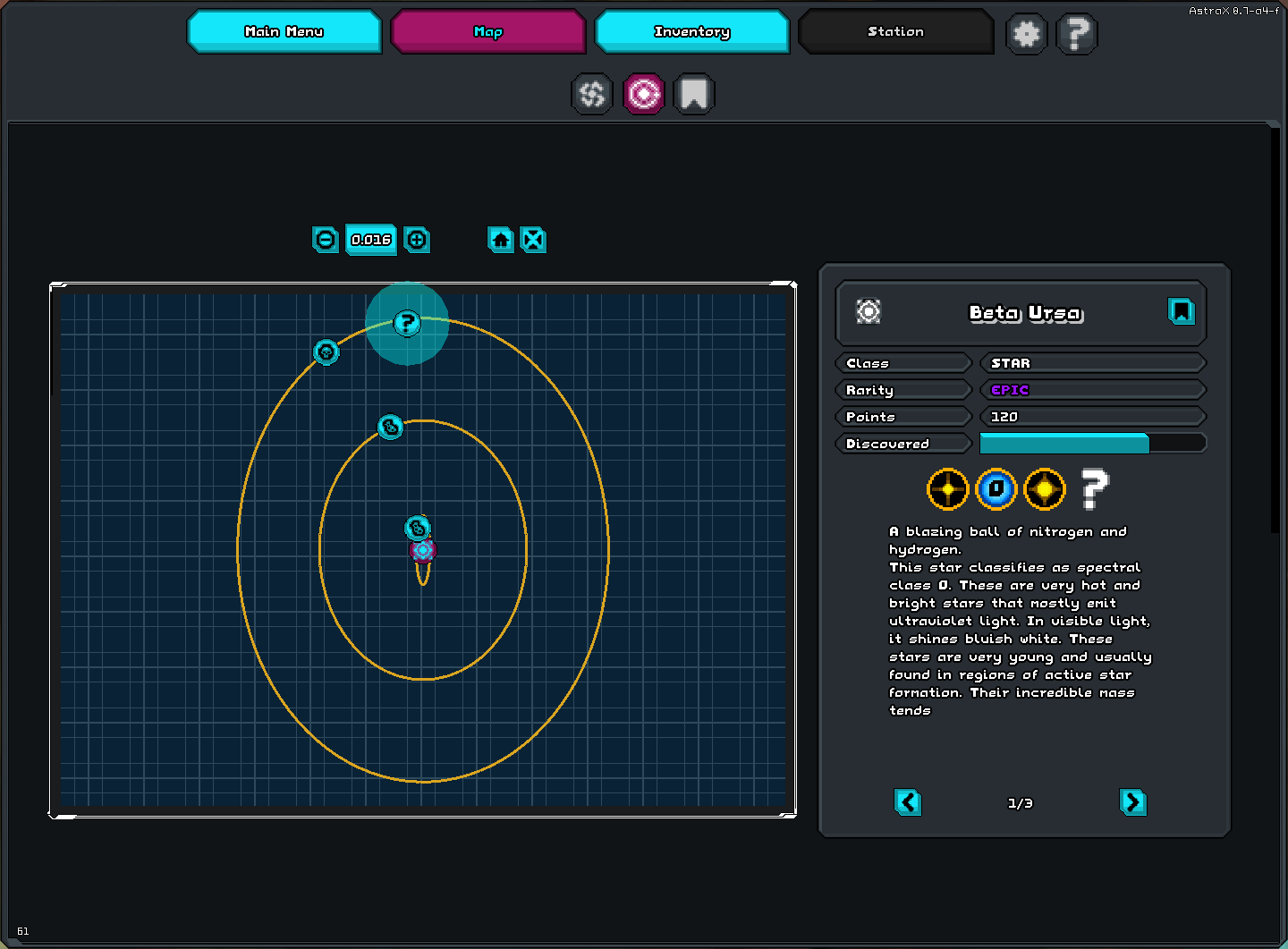 In the below screenshot, you can see the star map with a procedurally generated star, Beta Ursa, selected. To the right is the discovery information panel which indicates with the question mark icon that there is one unknown planetary trait left to discover.